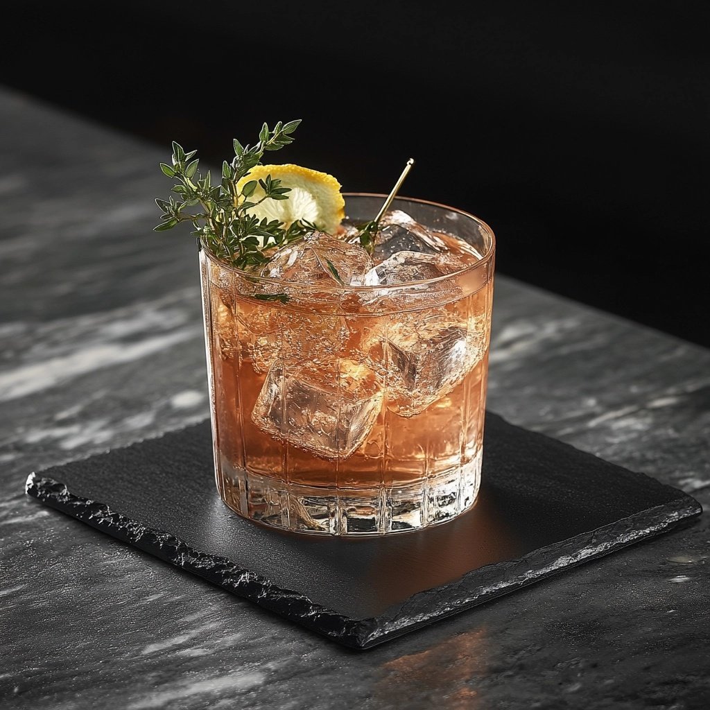 Presentation Tip: Serve on a black slate or marble coaster to accentuate the rich, amber-pink hue of the cocktail, with a sprig of thyme beside for an elegant touch.